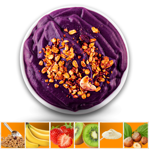 Frutas Frescas: Creme de açaí, 2 opções de frutas, Amendoim, Ovomaltine, Leite Condensado. Frutas podem adicionar sabores e texturas variados.